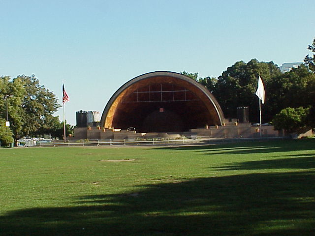 Boston's Fourth of July party site is the Hatch Shell. The Boston Pop Orchestra has provided a concert for all before the fireworks are sent skyward. The longtime conductor of the Pops was Arthur Fiedler. Here we see a statue of him watching over the activities at the Shell.